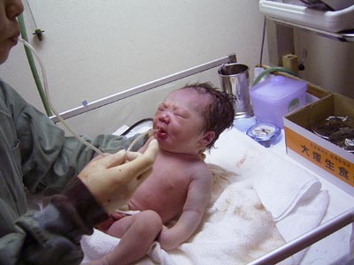 生まれたて、羊水を吸い出す。 アタマの形が・・・エイリアン状?! |