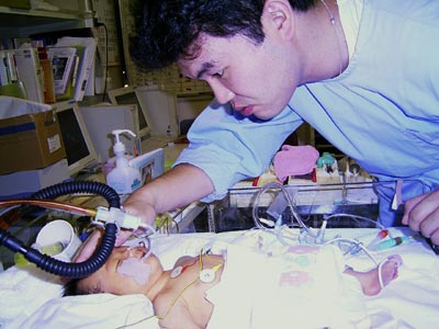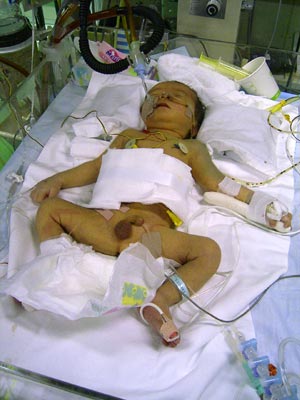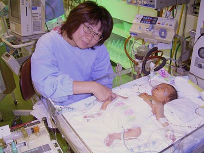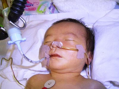 口からは人工呼吸器、鼻からは胃までチューブが入っています。そのチューブの中に、血が。唇にもこびりついています。 この小さな体で、よく大手術に耐えました。 |