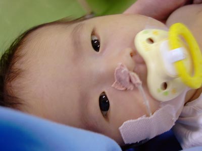 今日も眠そう。ぐずっていたらしく、久しぶりにおしゃぶりを貼り付けられていた。 |