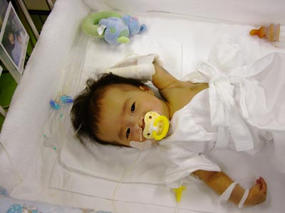これまでの保育器から広いベッドになったけど、慣れないのか隅の方に寝ていることが多いらしい。