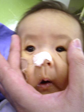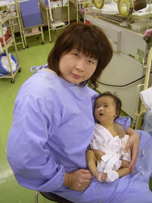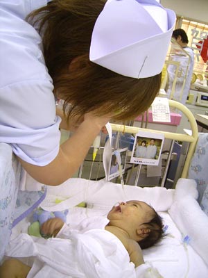 担当看護婦さんのIさんです。 左手が注射筒。 押し子で強制的に注入してくれています。 |