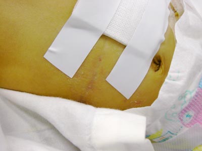 横一文字のお腹の傷跡。 よく3度も手術に耐えたものです。 それにしても肌が黄色い。 肝臓はまだ良くなっていないようです。 |