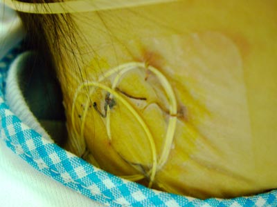 ぬ、縫い直すって・・・ 痛いんだろうなぁ。(TT) やっとの思いで心臓の近くまで入れたカテーテルは、抜けないように皮膚に縫って止めています。 |