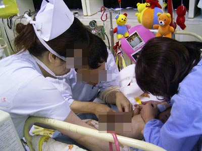 手足を押さえつけて1秒でも早く処置が終わることを祈ります。 |