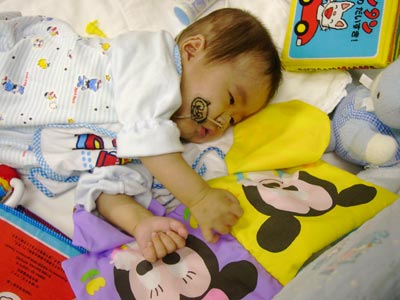 新しい絵本に夢中です。 本当に絵が好きです。 ・・・最近看護婦さんに「カッパ」と呼ばれているようです。(爆) |