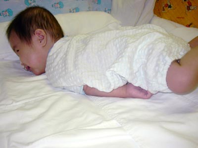 おお、惜しい! いつもその手が・・・。 でも寝返りできるのも、もうすぐのようです。 |