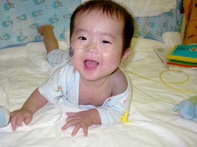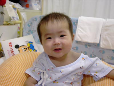 「どうだぁ〜!」 おお、手、抜けたの?! そろそろハイハイも始まるのでしょうか。 チューブが多いので・・・大変です。 |
