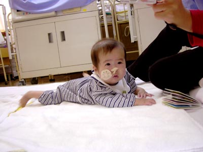 ・しばらくおすわり・寝返り・ハイハイのまねごと・絵本・ガラガラなどをして遊ぶ。