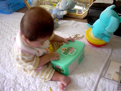 自らのお尻ふきを開けたり閉めたり、 引っ張り出したり・・・。 |