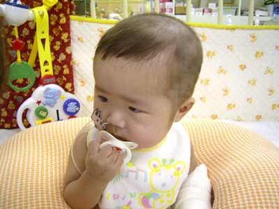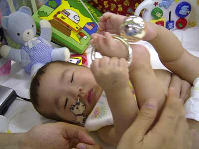お座りはできるようになりました。足の痛みは殆どなくなったようです。おしゃぶりも自分で口に運びます。 |