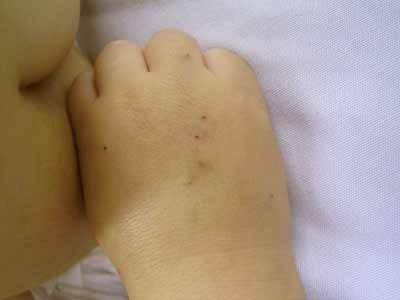 針穴だらけの手の甲。刺してから針先でごそごそ血管を探るのだそうです。聞いただけで痛そうです。これが両手、両肘・・・息子の血管は細く、曲がっているのか二股になっているのか、なかなか血管を捉えることができないのだそうです。 |