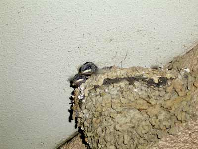 S院の駐車場、ツバメが巣をつくり、ヒナが口を大きく開け餌をねだっています。