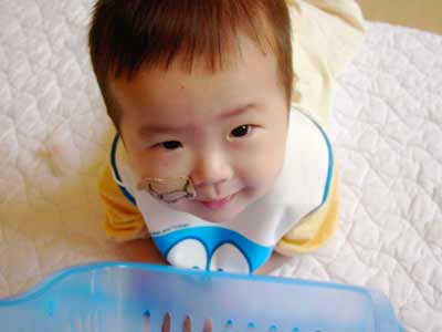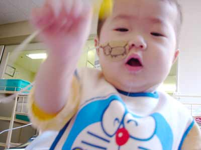 とおう! 自分の体内に続いているチューブだろうが、 息子の手にかかればおもちゃです。 以前「50mLになったら胃カテ取ろうか・・・」 って、N先生おっしゃってたんですけど・・・。 |