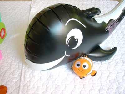 どんどんおもちゃが増え続け、ついにはこんな大きなシャチとニモ。シャチは魚ではありませんが、水に関係するモノを呼ぶのは両親ゆずりか・・・。 |