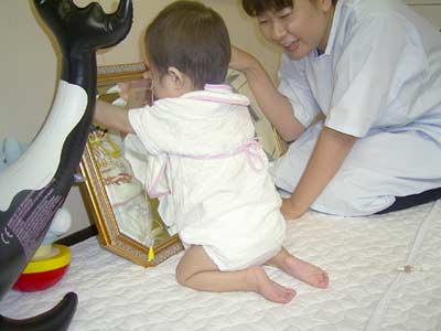 鏡を倒そうとしたり・・・ 何が楽しいんでしょう?? おっと、これ、膝立ちだ! |