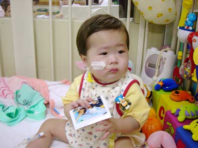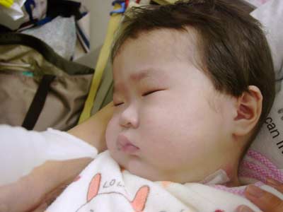 結局今晩は絶食に。 高熱のため、アイスノン3つで冷やします。 寝顔はそう悪くなく・・・ 単なる風邪で終わって欲しい。 |