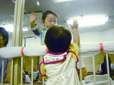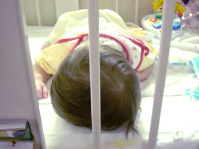 ナースステイションの窓越しにSちゃんと遊ぶ。
