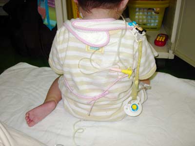 マーゲンチューブを背中で止めるの図。 試行錯誤です。 でも胃ろうが入れば、このチューブ必要はなくなります。 |