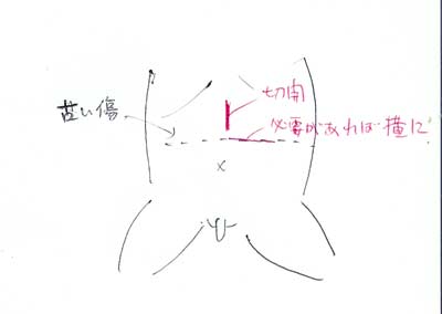 癒着剥離の範囲が広ければ、以前の傷に沿い、横に広げる。