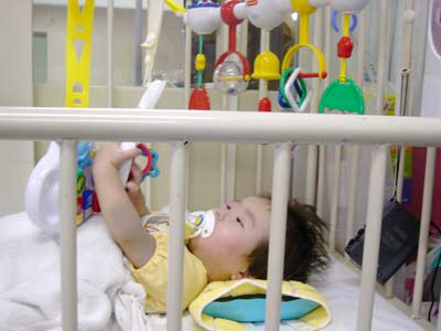 看護師さんが包帯をベットに渡しておもちゃを遊べるようにつけてくれていた。