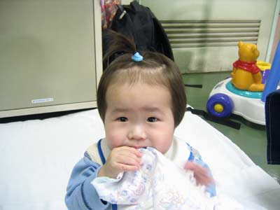 髪結んでいこうか・・・子にゴムを選んでもらったら水色をとった。