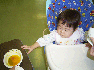 トットタッタに座らせる間も食器に手を伸ばそうとする。