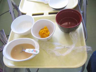 今日のお食事はなんと五分粥におすいもの・カボチャにホキ(魚)。