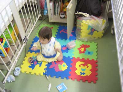 場所が狭いのでナースステーションでマットを敷いて遊ばせてもらう。