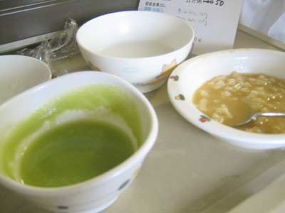 今日はアスパラに味噌煮込み(うどん細切り)、五分粥にスープ。