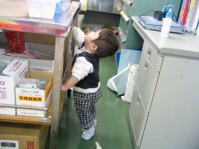 大好きな医療用具置き場で遊ぶ。