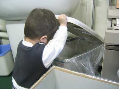 そこ、使用済みのオムツ入れだよ! 汚いから触るなー!! |