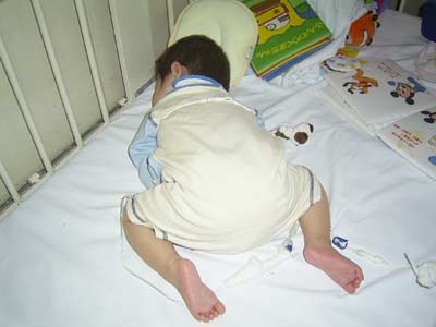 オムツ交換後、ベッドの柵をあげ、様子を見る。