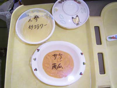 今日は全粥、人参・カリフラワー、鮭カボチャ、 これと隠しているリンゴジュース。 もちろん完食です。 |