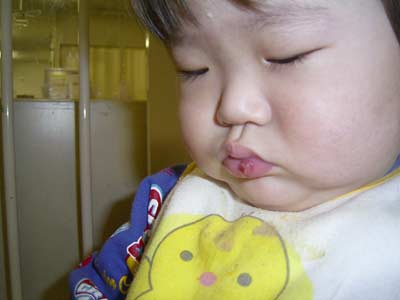 下唇にちょこっと傷が。 若いから、すぐに治るでしょう。 何たって1歳ちょっとですから。 |