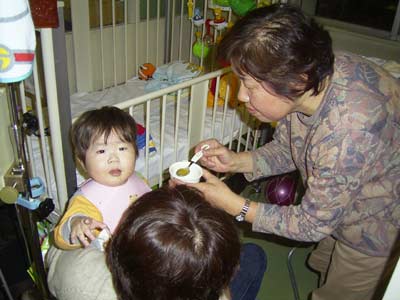 ごねる息子にババは根気よく気を引きながら食べさせる。