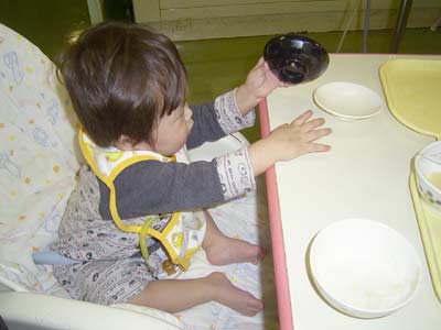 あ!あ! っとお椀の蓋で遊ばせ、 その隙に食べさせます。 |