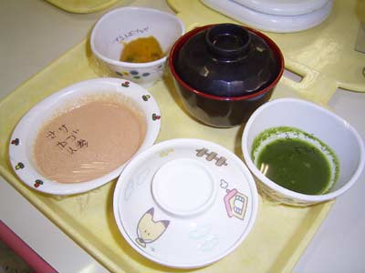 お粥にスープ、鮭・カブ・人参、小松菜のお浸し。中期食はカボチャでした。 |