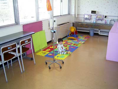 誰もいないプレイルーム、ぽつねんと座る息子。 |