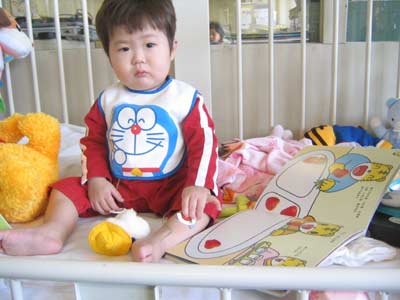病室に連れてくるとぐずっています。