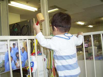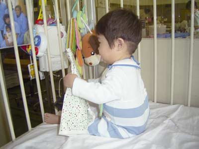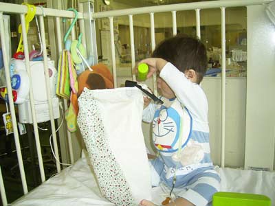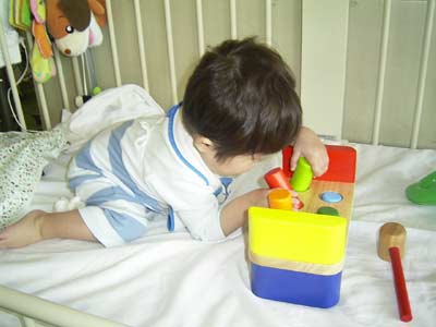 ベッドに運ばれてきた息子、早速ニューオモチャに夢中になる。