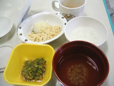 メニューはお粥・さけ(トマトケチャップ付き)・カボチャ、