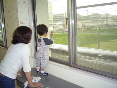 息子は窓に陣取り、ジーッと観察。