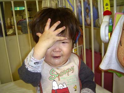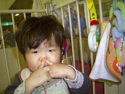 「鼻は?」 と聞くと鼻を指す。 それ、指し過ぎ。 鼻、潰れてますから・・・。 |