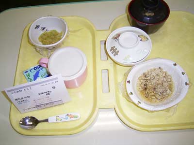 お粥に、汁物、カジキの煮付け、お浸し、オレンジジュース。