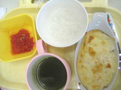 晩ご飯はお粥・トマト・グラタン・スープ。