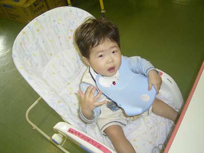 ご飯、早く〜! よだれかけ、逆さまだよ? |