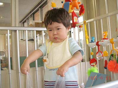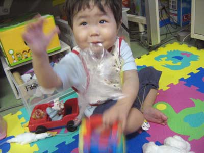 むん! このビニールのおもちゃ、 全部ボクの! |