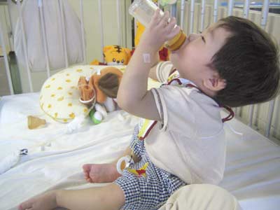 ぷふぁ〜! うめぇ〜!! ほ乳瓶は、まだやめれんね。 |