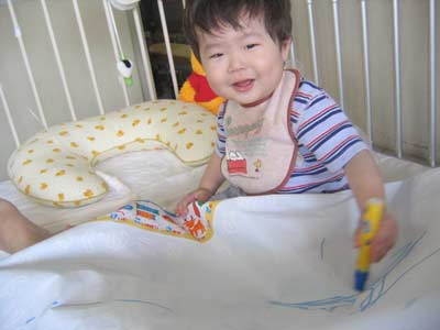 ベットでは、昨日購入した水で書ける落書きマットを出して遊ぶ。