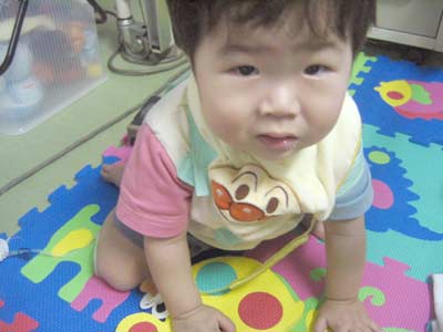 起きあがるとベットサイドのマットに降りて遊ぶ。